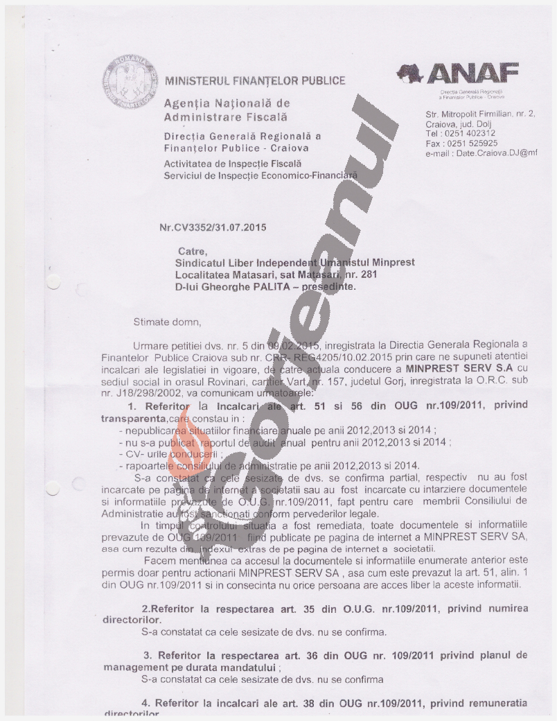 Finanţiştii de la Direcţia Regională a Finanţelor Publice(DGFP) Craiova veniţi în control la Minprest Serv Rovinari, în urma unei sesizări scrise transmise acestei instituţii de control de către Sindicatul Liber Umanistul din cadrul Minprest, au obligat beneficiarii cursurilor de formare profesională, realizate pe banii unităţii în perioada 2013-2014, să restituie sumele cheltuite ilegal societăţii aparţinând Complexului Energetic Oltenia. Nu numai directorul Gabriel Giorgi a fost obligat astfel să restituie banii cheltuiţi în vederea efectuării unui curs făcut pe litoral şi diurna pentru o deplasare la Timişoara, ci şi cei doi inspectori de resurse umane ai unităţii, alături de alţi salariaţi, au fost declaraţi buni de plată pentru cursurile ilegale finalizate în staţiuni de la munte şi de la mare.