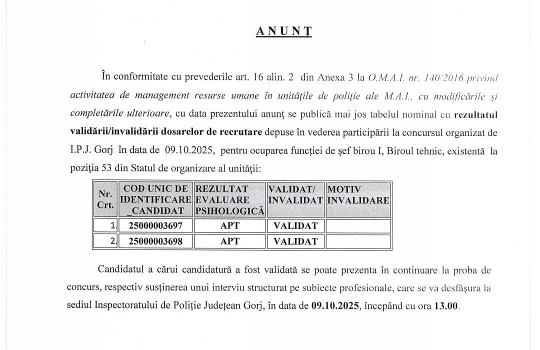 Ambele dosare de recrutare au fost validate, urmând să susțină interviul structurat pe subiecte profesionale. Biroul asigură din punct de vedere tehnic și material IPJ Gorj. În prezent, comisarul șef de Poliție Cătălin Tomescu este împuternicit să ocupe această funcție, din data de 2 iulie, până pe data de 1 ianuarie 2026.