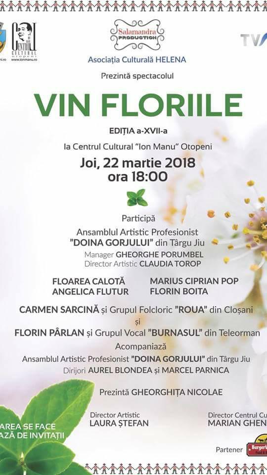 Ansamblul Artistic Profesionist „Doina Gorjului” din Târgu-Jiu, în frunte cu managerul Gheorghe Porumbel şi Claudia Torop, directorul artistic, se vor afla mâine, 22 martie, de la ora 18.00, la Centrul Cultural „Ion Manu” din Otopeni. Artiştii gorjeni vor urca pe scenă în cadrul celei de-a XVII-a ediţii a spectacolului „Vin Floriile”. De asemenea, în spectacol vor evolua şi următorii: Floarea Calotă, Marius Ciprian Pop, Angelica Flutur, Florin Boiţa, Carmen Sarcină şi Grupul Folcloric „Roua” din Cloşani, Florin Pârlan şi Grupul Vocal „Burnaşul” din Teleorman. Acompaniamentul spectacolului va fi asigurat de Ansamblul Folcloric „Profesionist „Doina Gorjului”, dirijori Aurel Blondea şi Marcel Parnica.
