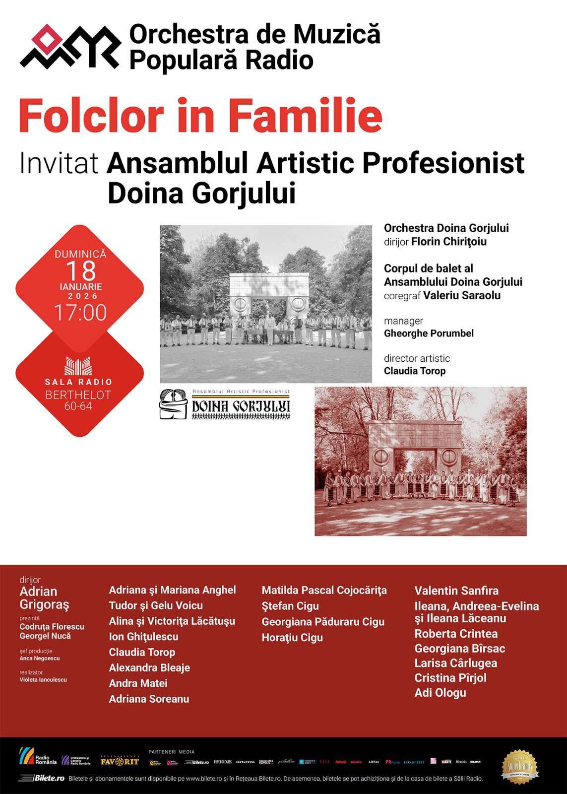 Bucureștiul va fi, duminică, 18 ianuarie 2026, gazda unei seri dedicate folclorului românesc autentic, în cadrul spectacolului „Folclor în Familie”, unde pe scenă vor urca artiștii îndrăgiți de la Ansamblul Folcloric „Doina Gorjului”. Evenimentul va începe la ora 17:00, la Sala Radio, și promite o seară plină de energie, tradiție și emoție.