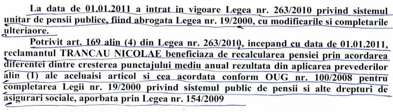 Casa de Pensii Gorj îşi motivează, însă, în scris, refuzul recalculării astfel: “Potrivit prevederilor alin.3, art. 169 din Legea nr. 163/2010, de creştere a punctajelor anuale prevăzute de alin.1 din acest articol de lege, beneficiază şi persoanele ale căror drepturi de pensie s-au deschis în perioada 1.04.2001-2.10.2008, inclusiv, numai în situaţiile în care, potrivit legii, la determinarea punctajului mediu anual s-au utilizat stagii complete de cotizare, prevăzute de legislaţia în vigoare în perioada respectivă. Prin urmare(..) dvs. nu aţi mai fost îndreptăţit să beneficiaţi de prevederile art. 169, al.4, din Legea 263/2010. La această dată(n.r.4.07.2014) nu există temei legal pentru a vi se recalcula drepturile de pensie”. Răspunsul nu l-a mulţumit însă pe reclamant care susţine că trebuia să i se recalculeze totuşi pensia întrucât Casa Naţională de Pensii Publice Bucureşti, în nume propriu, a dispus să se apeleze la această procedură în baza art. 169, al.4, al Legii 263/2010, începând cu data de 1.01.2011.