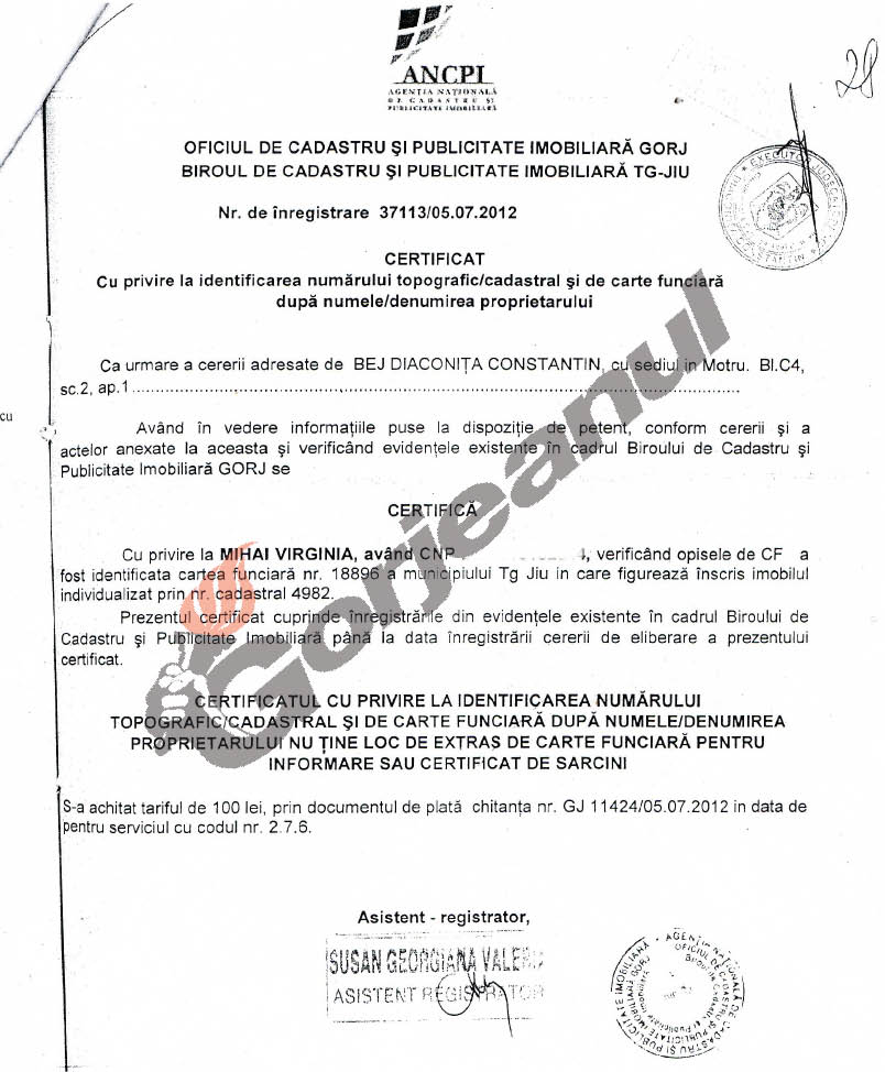 virginii (2)Oficiul de Cadastru Gorj a eliberat în 5 iunie 2012 un certificat cu privire la identificarea numărului topografic şi de carte funciară executorului judecătoresc din Motru, legat de Virginia Mihai, care a rămas luna trecută fără casă. Deşi femeia în cauză are trecut CNP-ul la cererea depusă de Constantin Diaconiţa, este identificată la OCPI Gorj o altă Virginia Mihai, singura de altfel care are o proprietate pe numele său, întregistrată la această instituţie. Mai exact OCPI Gorj o identifică pe Virginia Mihai, căsătorită cu Mihai Gheorghe, care domiciliază pe str. Microcolonie, nr. 17. Încurcătura de nume ajută executorul care realizează însă că e vorba de o altă persoană, cea trecută în acte având declarat un teren şi nu vila executată în noiembrie. Pe parcurs juriştii OCPI clarifică şi ei încurcătura şi o comunică executorului care, după cum s-a verificat săptămâna trecută la OCPI, continuă să insiste în documente că Virginia Mihai de pe Merilor are o proprietate ce poate fi executată pentru datoria de 80.000 de lei solicitată de Cornoiu Teodor Gheorghe.
