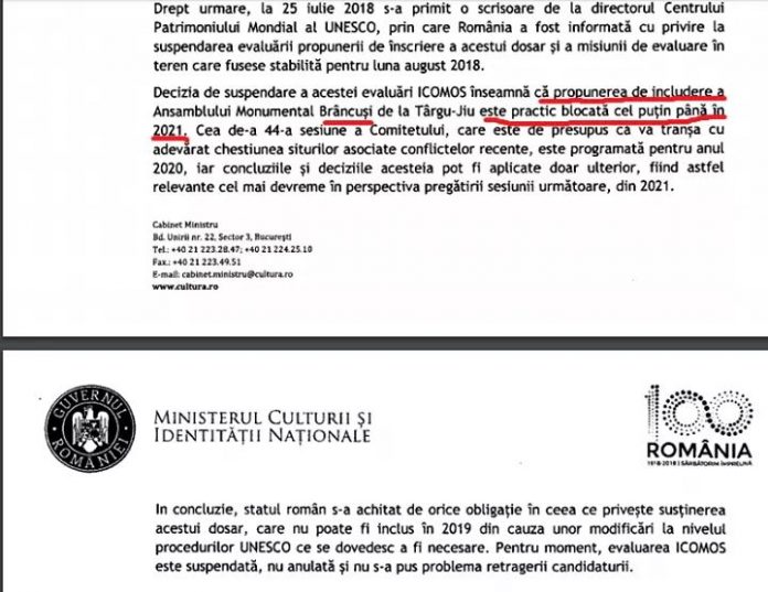 În ciuda faptului că specialiști de la nivel local, național si chiar internațional, alături de autoritățile locale, au efectuat alte demersuri pentru înaintarea unui nou dosar în vederea includerii operelor brâncușiene de la Târgu Jiu în UNESCO, sâmbătă, Dan Vîlceanu, deputat PNL de Gorj, le-a dat iubitorilor lui Brâncuși și operei acestuia din urmă, o veste deloc încurajatoare.