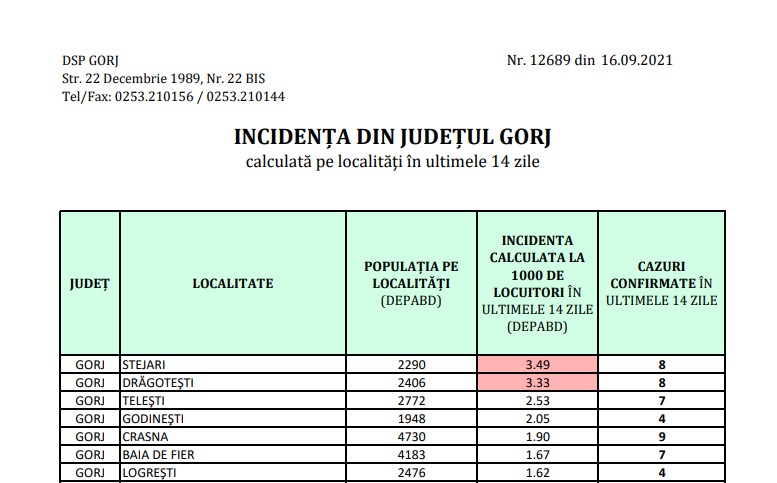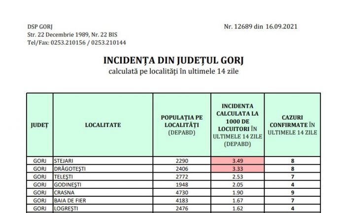 Comunele Stejari și Drăgotești se află în sceanriul roșu, aici rata de infectare depășind 3 cazuri la mia de locuitori.