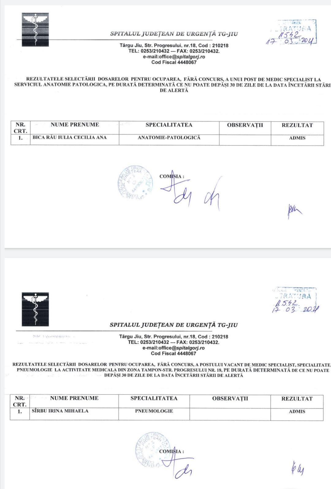 Colectivul Spitalului Județean de Urgență Târgu Jiu se mărește cu încă doi medici. Este vorba despre două doctorițe ale căror dosare au fost acceptate pentru ocuparea fără concurs pe perioadă determinată ce nu poate depăși 30 de zile de la încetarea stării de alertă. Cele două cadre medicale vor profesa la Serviciul Anatomie Patologică, respectiv Pneumologie din zona tampon din strada Progresului, nr. 18, Târgu Jiu.