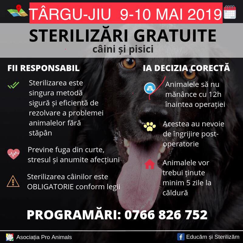 Asociația Pro Animals Gorj derulează astăzi și mâine o nouă campanie de sterilizări gratuite pentru câini și pisici, la Târgu-Jiu. ”V-ați săturat să vă fete cățeaua/pisica si să nu aveți ce să faceți cu puii?! V-ați săturat să vedeți “n” apeluri pe Facebook cu puiuți pe care nu îi adoptă nimeni, să vedeți străzile pline de animale abandonate, înfometate, bolnave, capturate de hingheri și adăposturi suprasolicitate?! Implicați-vă! Dacă aveți căței/pisici acasă, în jurul blocului, pe lângă case sau în anumite zone, aduceți-i la sterilizat, nu îi lăsați să se mai înmulțească! Se pot steriliza atât femele, cât și masculi, indiferent de specie (canină/felină), de rasă comună! Anunțați-vă vecinii, prietenii sau rudele de acest program și contactați-ne printr-un mesaj pentru programare la numărul de telefon 0766.826.752, de luni până vineri, între orele 09.00-17.00, iar noi vom reveni cu un telefon pentru confirmare. Noi vă ajutăm cu sterilizarea gratuită, vă împrumutăm cuști pentru transport și putem găzdui gratuit câteva zile – prin bunăvoința cabinetului colaborator All4Animals și în limita locurilor disponibile, animăluțele fără stăpân după sterilizare, dacă dumneavoastră nu aveți unde, dar, din păcate, nu putem, cel puțin deocamdată, asigura prinderea și transportul. După intervenție, animăluțele vor trebui ținute într-un loc curat minim 5-7 zile. În județul Gorj, organizăm campanii similare pe baza solicitărilor primite din partea primăriilor sau din partea proprietarilor / iubitorilor de animale (cu un minim de 20 de animale programate)”, au transmis reprezentanții Asociației Pro Animals Gorj.