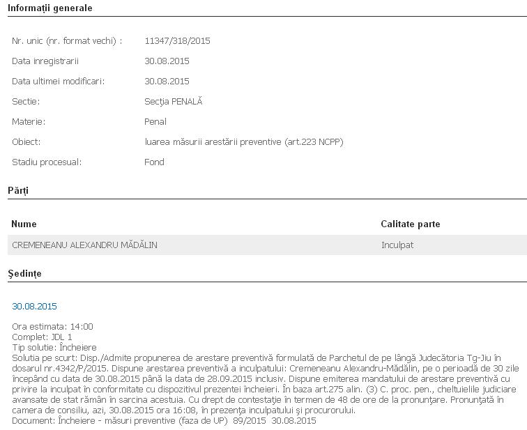 Demonstraţia dragostei lui Mădălin Cremeneanu a durat 10 minute, timp necesar acestuia să-i distrugă parbrizul maşinii fostei iubite, aflat pe numele mamei acesteia, şi o parte a proprietăţii actualului iubit al judecătoarei, fiul afaceristului Nicu Măroiu. Loverul s-a ales însă, la scurt timp după comiterea faptelor, cu două acuzaţii pentru două infracţiuni de distrugere, una prin lovire, iar cealaltă prin incendiere şi cu reţinerea sa pentru 24 de ore în arestul IPJ Gorj. La expirarea termenului de reţinere, Cremeneanu Jr. a declarat presei că nu are nimic cu familia Măroiu, căreia i-a distrus uşile de la garaj şi gardul de împrejmuire al locuinţei, el subliniind, de asemenea, că nu a consumat în seara incidentului droguri ori alte substanţe cu efect halucinogen.