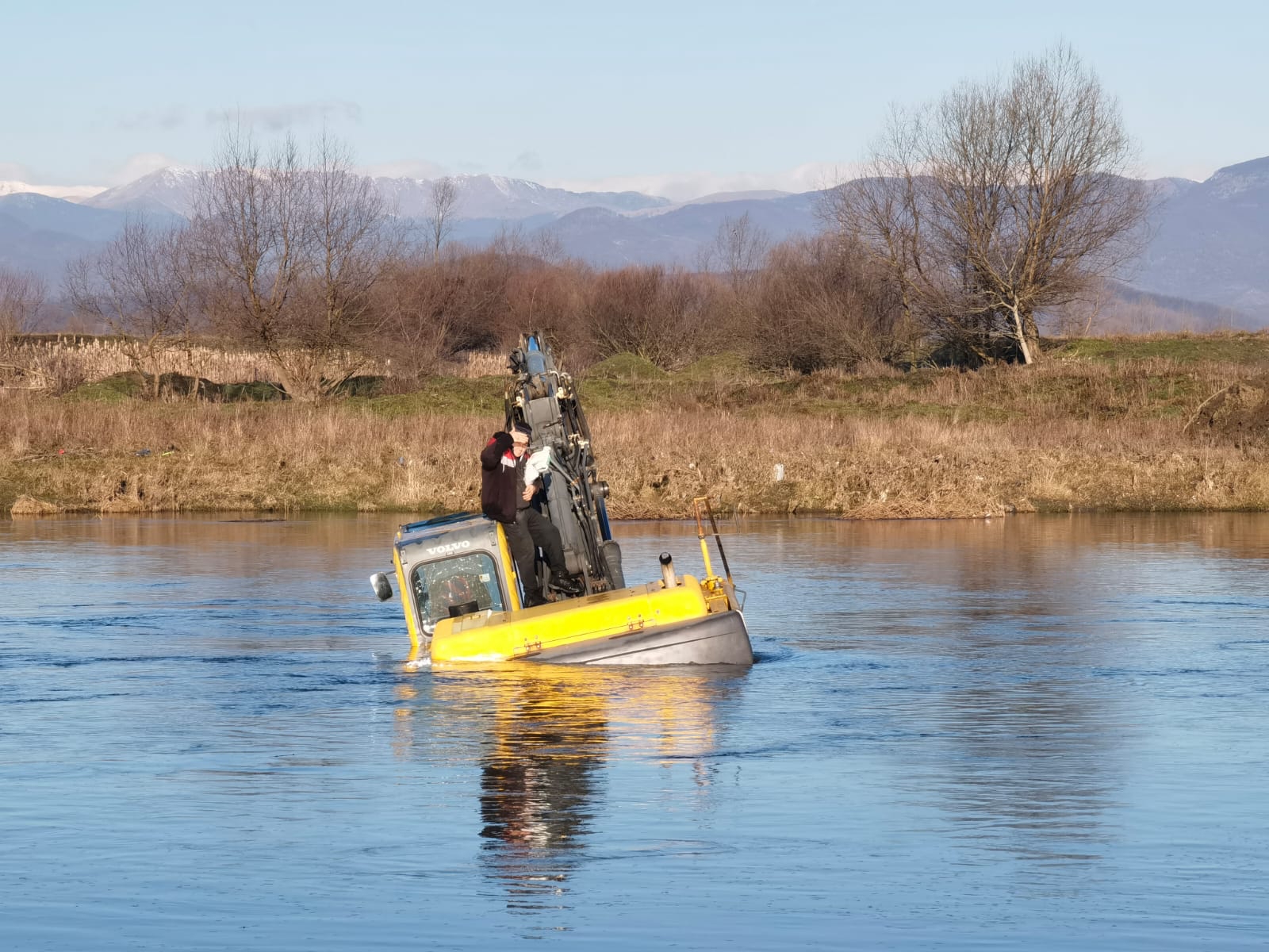 Un excavatorist a cerut ajutor după ce, dorind să traverseze Jiul cu utilajul pe care îl conducea, a rămas blocat în mijlocul apei. Pompierii de la ISU Gorj l-au scos din apă cu ajutorul unei bărci de salvare.