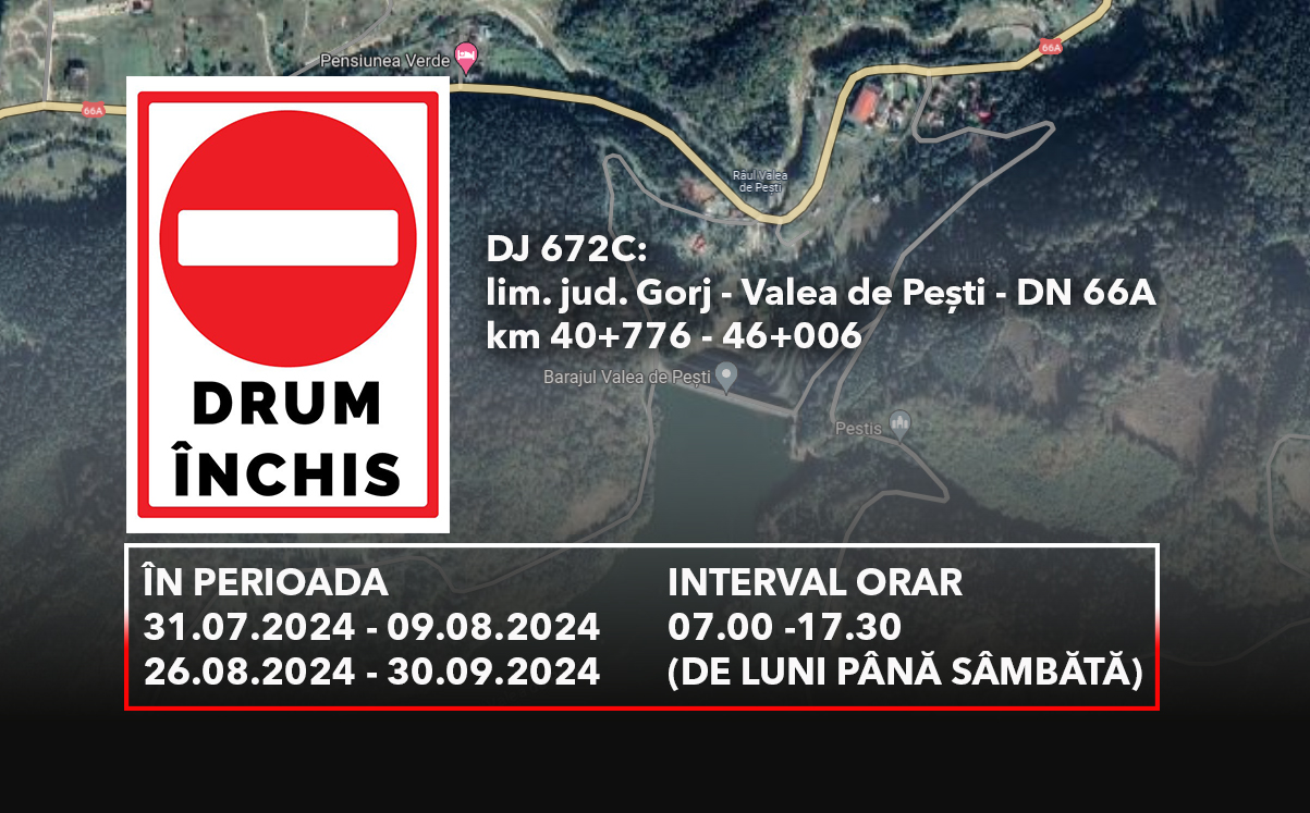 În perioadele menționate, accesul rutier va fi oprit în vederea executării lucrărilor în cadrul obiectivului de investiții „Modernizare DJ 672C limită jud. Gorj – Valea de Pești – DN 66A”, finanțat prin Programul Național de Investiții „Anghel Saligny”.