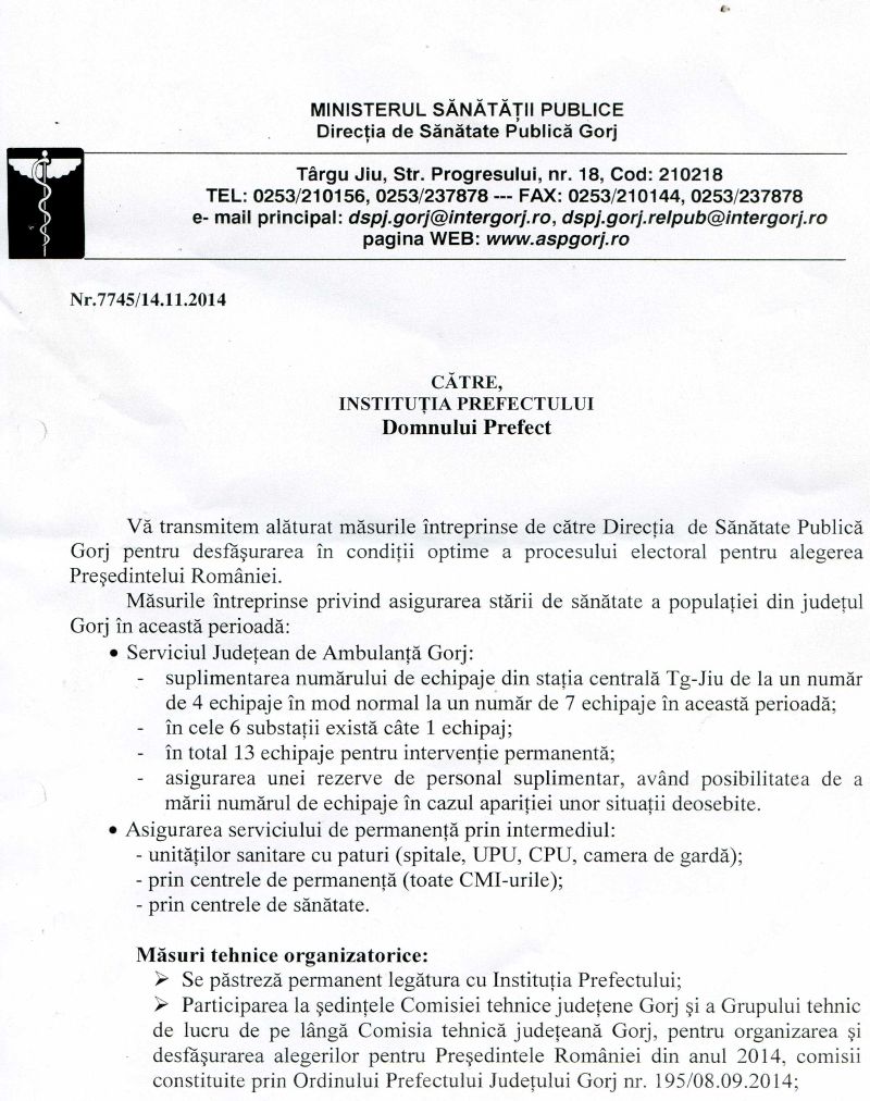 Gorj a stabilit nişte măsuri speciale pentru alegerile de duminică, ce au fost transmise Instituţiei Prefectului. Numărul de echipaje ale Ambulanţei Gorj, staţia centrală Târgu-Jiu, a fost suplimentată, de la 4 la 7. În acele substaţii a existat câte un echipaj disponibil, fiind la nivel de Gorj 13 echipaje. S-au asigurat rezerve pentru personalul suplimentar şi s-a asigurat permanenţă.
