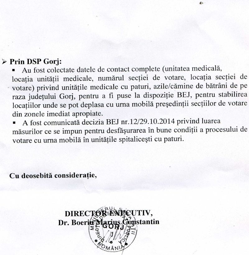 Marius Boeriu, directorul DSP Gorj, nu va face o anchetă la spitalul din Bumbeşti-Jiu deoarece cele întâmplate sunt doar de competenţa poliţiei care a întocmit deja de ieri un dosar penal în această cauză. “Noi ne-am făcut datoria şi am atenţionat în scris, şi telefonic, conducerea acestui spital să se ocupe de cererile privind urna mobilă. Nu înţeleg cum la primul tur acolo s-au înţeles cele transmise iar acum aceastea s-au ignorat. DSP Gorj nu va face o anchetă acolo pentru că nu este competenţa noastră să facem asta”, a declarat directorul Boeriu. De altfel, conducerea DSP