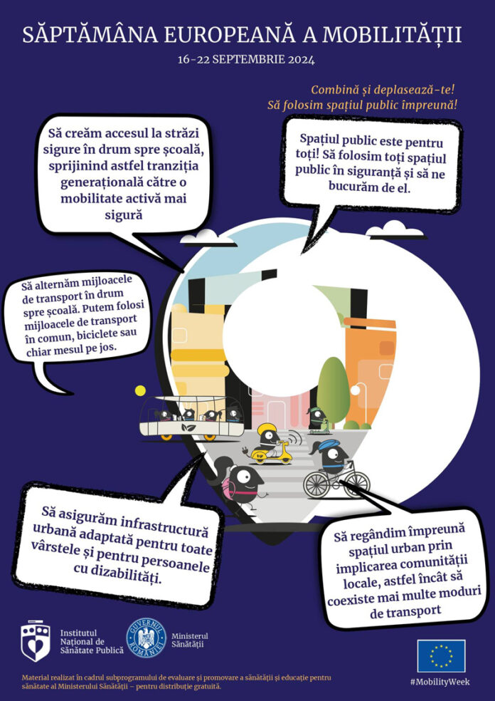Săptămâna europeană a mobilității este campania emblematică de sensibilizare a populației în ceea ce privește mobilitatea urbană durabilă propusă de Comisia Europeană. Prin aceasta se urmărește promovarea schimbărilor comportamentale în favoarea mobilității active, a transportului public și a altor soluții de transport curate și inteligente. Campania se desfășoară în perioada 16-22 septembrie, în fiecare an, culminând cu „Ziua fără autoturisme”, eveniment organizat în orașe din toată lumea în data de 22 septembrie. Evenimentul evidențiază numeroasele beneficii pe care cetățenii le au de pe urma renunțării la autoturisme – inclusiv reducerea poluării aerului și promovarea mersului pe jos și cu bicicleta într-un mediu mai sigur. Tema din acest an a Săptămânii europene a mobilității este „Combină și deplasează-te! Să folosim spațiul public împreună!”. Spațiul public comun aduce multe beneficii societății, precum mai multă siguranță rutieră, mai puțină poluare fonică și atmosferică și o mai bună calitate a vieții. Pentru a sprijini inițiativa mobilității urbane, Comisia Europeană a elaborat Planul de Acțiune în domeniul mobilității, care își propune două obiective strategice: până în anul 2050 – eliminarea treptată din mediul urban a autoturismelor care folosesc carburanții convenționali și până în anul 2030 – tranziția spre o logistică cu zero emisii în marile centre urbane. În ceea ce privește populația generală, tranziția spre mobilitatea alternativă se poate face prin: optarea pentru mijloacele de transport alternative (biciclete, trotinete, transportul în comun) și reducerea dependenței față de mașina personală. Prin utilizarea formelor durabile de mobilitate activă (mersul pe jos, mersul cu bicicleta, cu trotineta, skateboard-ul) se obțin atât rezultate bune din punct de vedere al calității vieții, prin scăderea poluării aerului, prin scăderea aglomerației și congestiei traficului, a poluării fonice cât și efecte benefice asupra sănătății. Activitatea fizică desfășurată în mod regulat are capacitatea de a îmbunătăți controlul tensiunii arteriale și al diabetului zaharat, scade riscul de hipertensiune arterială și diabet zaharat, dezvoltă musculatura și întărește sistemul osos, ajută la scăderea în greutate, îmbunătățește coordonarea, reduce stresul și îmbunătățește metabolismul, întărește sistemul imunitar și asigură o stare de bine și timp de calitate. Direcția de Sănătate Publică Gorj, prin Compartimentul de Evaluare și Promovare a Sănătății, desfășoară în perioada 16 – 22 septembrie 2024 activități de informare cu privire la beneficiile practicării activității fizice și cu ocazia Săptămânii Europene a Mobilității, cu scopul de a motiva populația să folosească mijloacele de transport nemotorizate, dat fiind impactul pozitiv asupra sănătății.