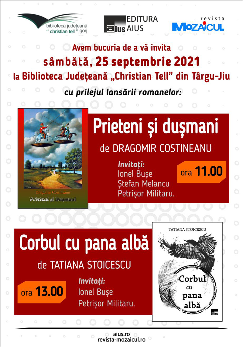 MANSARTA – mansarda Bibliotecii Județene Gorj va găzdui sâmbătă, 25 septembrie 2021, la ora 11.00, lansarea romanelor ,,Prieteni și Dușmani”, de Dragomir Costineanu, și ,,Corbul cu pana albă”, de Tatiana Stoicescu Tichelea. Evenimentul este organizat de Editura Aius din Craiova și Biblioteca Județeană ,,Christian Tell” și îi va avea ca invitați pe scriitorii Ionel Bușe, Ștefan Militaru și Petrișor Militaru.