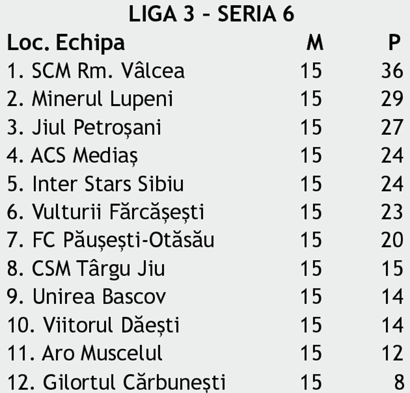După 15 runde scurse din Seria 6 a Ligii 3, Vulturii Fărcășești are cel mai bun parcurs dintre echipele gorjene. Fotbaliștii lui Daniel Bălașa au acumulat 23 de puncte și sunt la o singură lungime de locurile care asigură play-off-ul.