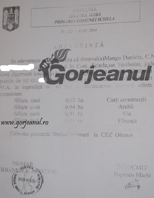 Salariata Maria Popescu a ajuns astfel, în februarie, să fie cercetată de Inspectoratul de Poliţie al Judeţului Gorj pentru săvârşirea infracţiunii de neglijenţă în serviciu, iar pe parcurs de fals intelectual. Totul, deoarece funcţionara primăriei, responsabilă cu evidența registrului agricol, ar fi eliberat o adeverință pentru vecina reclamantului, totodată, soacră a acestuia, din comuna Schela.