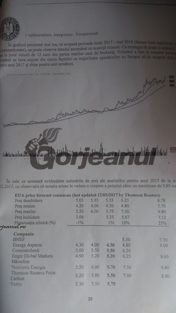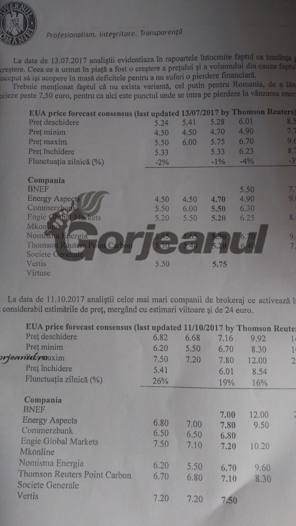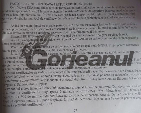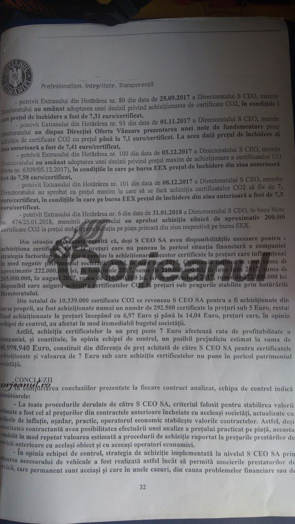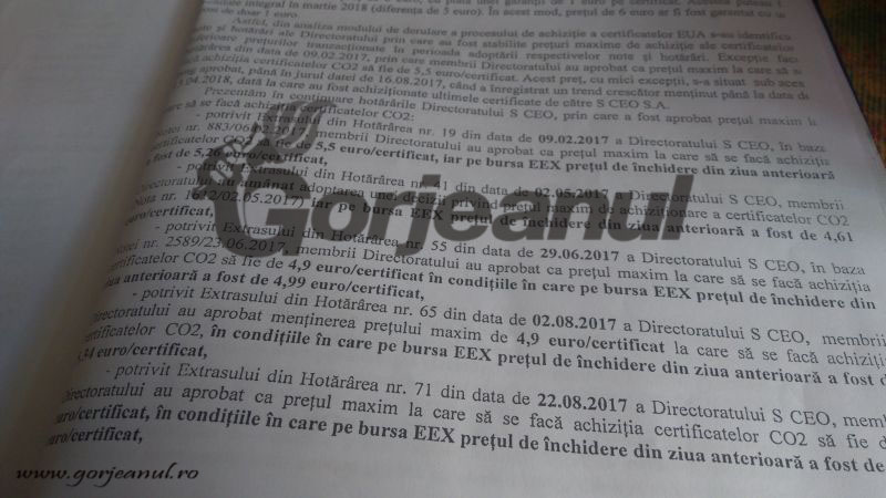 -potrivit extrasului din hotărârea nr.101 din 8.12.2017 a Directoratului CEO membrii Directoratului au aprobat prețul maxim cu care să se facă achiziția de certificate CO2 la 7,3 euro/certificat, deși pe bursa EEX prețul de închidere din ziua anterioară a fost de 7,38 per certificat. Abia pe data de 31 decembrie 2017, adică în ultima zi a anului trecut, Directoratul CEO decide în baza notei nr.474 din 25 decembrie 2018 să aprobe achiziția zilnică, de aproximativ 200.000 de certificate CO2, la prețul stabilit prin licitație pe piața primară din ziua respectivă pe bursa EEX, se arată în raport.