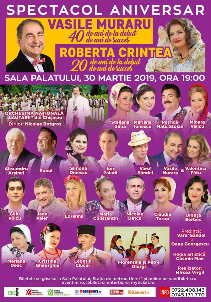 După un album de excepție, după videoclipuri realizate profesional și după milioane de vizualizări la piesele sale, îndrăgita solistă de muzică populară Roberta Crintea surprinde din nou, acum poate mai mult ca oricând. Un obiectiv de o importanță majoră, un țel, un scop pe care cu sârguință vrea să-l atingă este un spectacol de zile mari, un spectacol de anvergură, care se va desfășura la cea mai mare sala din România: Sala Palatului. Este vorba despre un spectacol aniversar, la 20 de ani de debut pe scena muzicii populare. Biletele s-au pus deja în vânzare și se găsesc la Sala Palatului, dar și online, pe: vandbilete.ro, eventim.ro, iabilet.ro, entertix.ro și myticket.ro.