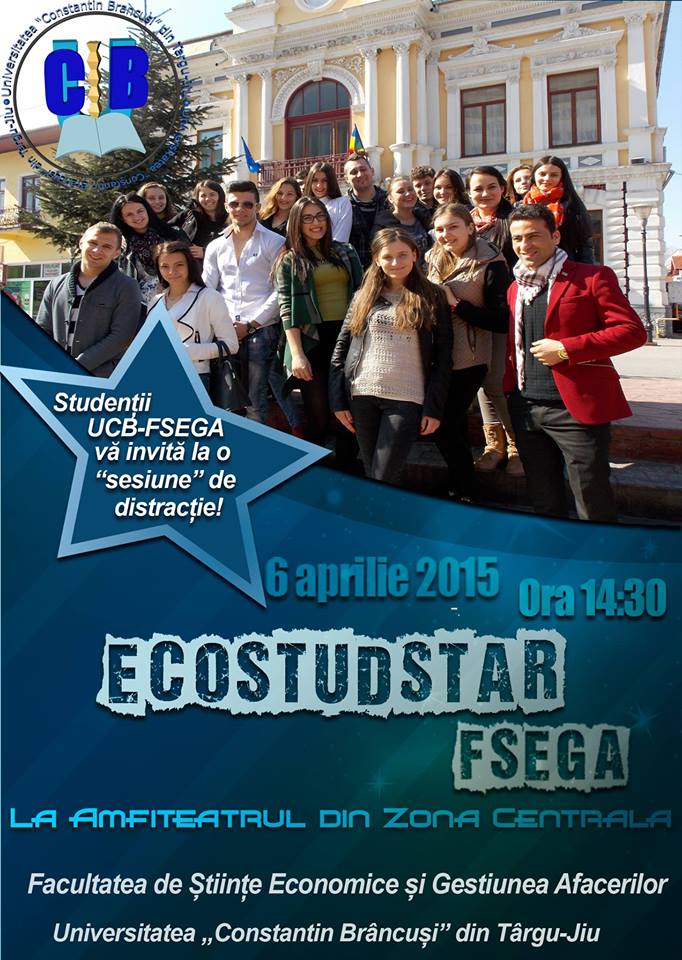 Luni, 6 aprilie 2015, are loc prima ediţie a spectacolului studenţesc EcoStudStar, în Amfiteatrul din zona centrală a oraşului Târgu Jiu, începând cu ora 14.30. Cu sprijinul conducerii Universităţii „Constantin Brâncuşi” din Târgu Jiu şi a Facultăţii de Ştiinţe Economice şi Gestiunea Afacerilor, studenţii economişti şi-au propus să arate că nu doar cifrele sunt talentul lor. Ionela Evelina Tomescu, studentă în anul II, spune că acest eveniment a fost gândit ca o invitaţie la un dialog deschis, care se adresează elevilor din judeţ. Pentru a înţelege mai bine conceptul EcoStudStar, Evelina a răspuns câtorva întrebări.