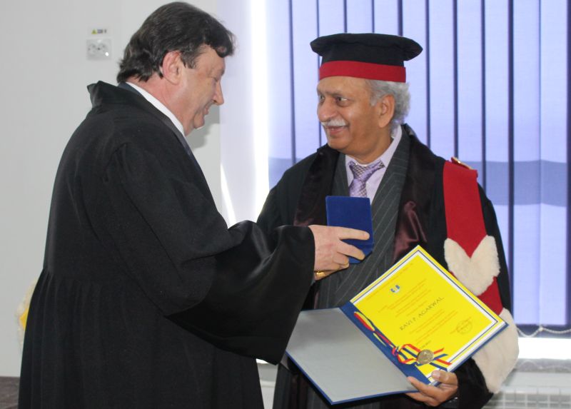 În cadrul festivității de acordare a titlului de Doctor «Honoris Causa» al Universității «Constantin Brâncuși» din Târgu-Jiu, putem spune că «lecția de viață» a tumultului vremii care vremuiește a prilejuit «ochilor minții» evidențierea faptului că paradigmele prin care oamenii și-au explicat și au gândit lumea s-au schimbat și s-au succedat ca urmare a ascensiunii științei, așa cum sublinia domnul prof. univ. dr. Adrian Gorun, în introducerea la tradiționalul moment «Laudatio», mai ales că tehnologiile și inovațiile aplicate au schimbat fundamental matricea existențială a omului. “Universul științei este un univers al cunoașterii specializate, esențializate, abstractizate, axiomatizate, a explicat președintele Senatului UCB Târgu-Jiu, deoarece reprezintă o luare la cunoștință, în planul raționalului, despre macrounivers sau despre microuniversuri, a căror ființare nu este condiționată de prezența subiectului cunoscător. De aceea, nu mai reprezintă o noutate, azi, ca Senatul Universității «Constantin Brâncuși» din Târgu-Jiu, începând cu anul 2006, așa cum fac universitățile respectabile, și-a însușit principiile academice universale, apropiindu-și marile personalități prin gesturi simbolice de recunoaștere și apreciere a valorii lor. Putem, deja, vorbi de pleiada selectă a comunității noastre universitare, reprezentată de nume cu veritabilă rezonanță mondială sau europeană: Gheorghe Zamfir, Dumitru Fărcaș, Tudor Gheorghe, Nicolae Manolescu, Stock Gűnther Stock, Andrei Marga, Î.P.S. Părinte dr. Irineu Popa, Ecaterina Andronescu, Ioan Alexandru, Mihai Golu, Iosif Chiuzbaian Ion Dogaru, Walter Leal, Bogdan Cuza, Alexandru Boboc, Miguel Barnet ș.a.m.d. Azi, completăm această «echipă de aur» cu unul dintre marii matematicieni ai lumii, domnul Ravi Agarwal, din SUA, profesor la «Texas University Kingsville», căruia îi urez bun venit în citadela noastră academică, patronată spiritual de cel mai mare sculptor al modernității, genialul Constantin Brâncuși. Fie ca onoarea pe care ne-o face, să reprezinte simbolul și imboldul colaborării pe tărâmul științei, puse în slujba condiției umane! Domnul Ravi Agarwal este un matematician de prestigiu, reușind să se impună, prin investigațiile sale într-un domeniu atât de dificil, în conștiința cercetătorilor de marcă de azi. Pentru el, ca de altfel pentru orice teoretician rafinat, cunoașterea științifică, rezultat al unor specializări crescânde și al folosirii unor mijloace, tehnici și metode de mare eficacitate, trece dincolo de aparențe, descoperind legi și teorii pe care le formalizează în limbaje simbolice. Formându-și un nivel critic reflexiv și supunându-și descoperirile unor exigențe înalte, domnul Ravi Agarwal a reușit să facă tangibile, mental, rezultatele idealizării sau abstractizării constructive de tip matematic. Reținând toate acestea, mă consider îndreptățit să vorbesc, deși nu sunt un specialist în acest domeniu de marcă, despre o veritabilă filosofie a matematicii la profesorul Agarwal. În arhitectura acestei filosofii, laureatul nostru pornește de la o idee fundamentală: aceea că forma esențială a dezvoltării cunoașterii științifice contemporane este teoria. El face distincția între teoriile logico-matematice și teoriile factuale, pornind de la deosebirile epistemologice și metodologice dintre ele. Întrucât teoriile logico-matematice studiază structuri abstracte, care în forme generale reflectă anumite relații și legități alte realității obiective, ele își au sursa primară în ceea ce psihologia genetică numește experiența matematică., iar domnul Ravi Agarwal a înțeles pe deplin menirea matematicii și implicit a sa, ca matematician de elită, însușindu-și o meditație de o mare profunzime intelectuală” a încheiat domnul Adrian Gorun.