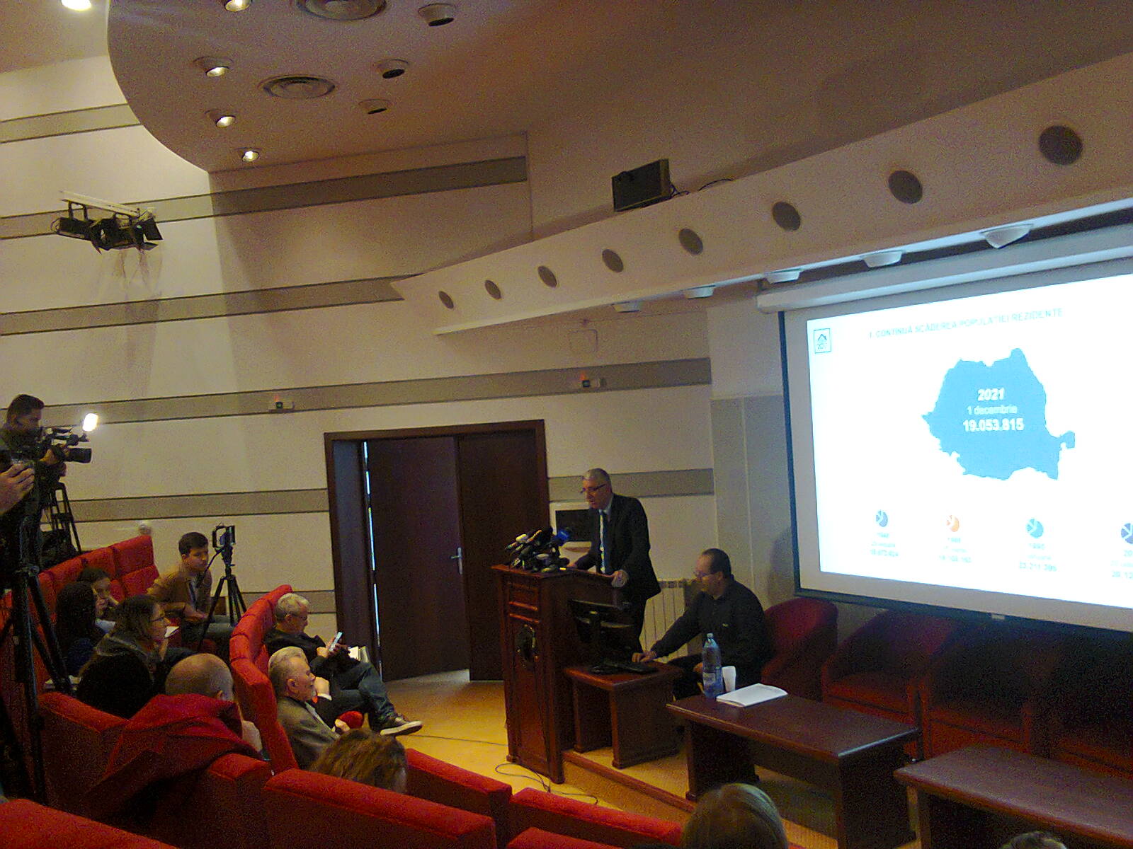 Redăm aproape în întregime cuvântul domnului preşedinte Tudorel Andrei, pentru că merită cu prisosinţă acest lucru: ,,Noi ne-am angajat încă din 2013, să asigurăm un recensământ «fără hârtie», şi să ştiţi că n-a fost o decize uşoară, că nu a fost o activitate simplă, iar, eu, unul, mi-am asumat aceste lucruri împreună cu echipa, pentru că este o obligaţie să fim acolo unde sunt toţi! Ştiam ce ne aşteaptă, că o să avem o relaţie cu populaţia, iar, aceasta nu este o chestiune simplă, pentru că pot fi comentarii, obiective, ca şi unele subiective, dar, mulţumesc presei că a promovat pozitiv această acţiune şi pot spune că acţiunea mea este o acţiune a întregii societăţi! Dacă am reuşit să ajungem la sfârşit, iar, eu sunt mulţumit de ceea ce s-a realizat, acest lucru înseamnă că toţi am avut o contribuţie importantă, atât în partea de online, iar, 48% să realizezi pentru prima dată un asemenea obiectiv, poate că n-a fost o minune, dar, a fost un lucru extraordinar! Aş vrea să trecem peste ceea ce înseamnă un recensământ, şi în perioada următoare, să avem unele dezbateri punctuale pe datele ultime de la recensământul populaţiei şi al locuinţelor, pentru a vedea ce vom putea face la viitorul recensământ! Acest recensământ a trecut cu bune şi poate, cu mai puţin bune, dar, la următorul recensământ, şi spun acest lucru aici, în premieră, nu avem voie să mai intrăm în teren la viitorul recensământ! Suntem obligaţi, din punctul de vedere al evoluţiei tehnologiei, să avem un recensământ numai pe surse administrative! Cu o singură menţiune – să găsim acele mecanisme sau aceeaşi arhitectură a informaţiei, cu câteva variabile esenţiale pentru populaţia României, fiind vorba despre caracteristicile etno-culturale: etnie, religie, limbă maternă, şi alte asemenea variabile pentru care nu avem deocamdată surse administrative. Va trebui să avem o dezbatere pe un asemenea subiect, pentru că e nevoie de o lege a statisticii populaţiei, şi mai ales, pentru că e necesar să avem şi o evaluare a migraţiei internaţionale, dar, nu la pragul de 12 luni, ci, la pragul de şase luni, pentru că la migraţia pe termen scurt, putem avea o situaţie mai clară a populaţiei României. Aş vrea să evidenţiez câteva rezultate în urma prelucrării primelor date de la ultimul recensământ, şi aş începe cu faptul că nu numai populaţia rezidentă a României, care e peste 19 milioane, pentru că statistica publică, cel puţin din nevoi naţionale, ne referim la toţi locuitorii care au o carte de identitate sau care au o relaţie juridică cu statul român, prin certificatul de naştere. De aici apar cele două diferenţe: pe de o parte, avem 19.033.000 la recensământul populaţiei şi locuinţelor, iar, pe de altă parte, avem populaţia după domiciliu, care e peste 22 de milioane, după datele de la 1 ianuarie 2022. Eu aş privi problema în contextul câtorva date de referinţă! În primul rând, m-aş referi la anul 1966, pe care l-am ales ca an de referinţă, pentru că începând cu anul 1967, apar primele efecte ale politicii de creşetere a numărului populaţiei rezidente, iar, în acest sens, vedem din «piramida vârstelor» cum s-a ajuns şi de ce s-a ajuns la această situaţie, raportată la populaţia din anul 1948, când observăm că pe parcursul ultimilor treizeci de ani, avem o scădere a populaţiei de aproape patru milioane de persoane, iar, dacă ne comparăm cu anul 1966, vedem că în anul 2021 populaţia României este cea de la nivelul anului 1966! «Piramida vârstelor» este un instrument important pentru a vedea şi efectul unor decizii politice, al unor schimbări politice, sau al momentelor importante din istoria unei ţări! Avem «piramida vârstelor» de la ultimele două recensăminte, când observăm o scădere a numărului populaţiei rezidente tinere, atât la recensământul din 2011, cât şi la recensământul din 2021, iar, la acest din urmă recensământ, (cel din 2021 n.n.) baza este şi mai mică, iar, la nivelul populaţiei de sub un an de zile se observă o scădere de 18%, şi chiar dacă această «cohortă» poate să crească în perioada următoare, pentru că între 2002 – 2013 şi 2014 este perioada de vârf, trebuie să ne gândim la un proces caracterizat prin numărul de copii născuţi în străinătate şi înregistraţi în România după o anumită perioadă de timp! E posibil ca baza «piramidei» să fie ameliorată în perioada următoare, întrucât copiii care s-au născut în 2021, pot fi înregistraţi şi pot rămâne în populaţia rezidentă”!