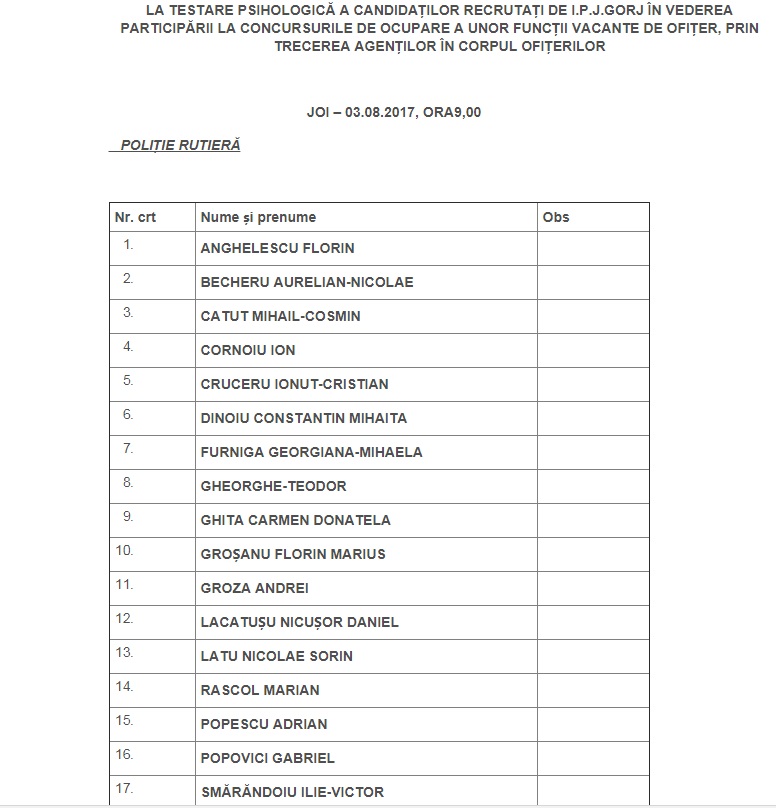 Printre cele 17 persoane care s-au înscris la examenul pentru postul de ”ofiţer I”,  în cadrul  Poliției Târgu-Cărbunești, la Compartimentul Rutier, se află și două femei. Georgiana Mihaela Furnigă, agent de Poliție, în cadrul Serviciului Cabinet- Centrul Operațional și Carmen Donatela Ghiță și-au depus dosarul, pentru ocuparea funcțiilor vacante de ofițeri. Toți candidații sunt așteptați, pe 3 august, la ora 09.00, la Colegiul Național ”Tudor Vladimirescu” din Târgu-Jiu, pentru testarea psihologică.