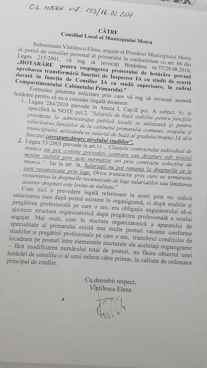 Consiliera primarului de Motru, Elena Vintilescu, a transmis, la finalul săptămânii trecute, o adresă Consiliului Local prin care îi solicită acestui for să-i ia în considerare studiile superioare absolvite. Mai exact, Vintilescu se revoltă astfel împotriva Consiliului Local Motru, care și-a permis, anul trecut, aroganța de a nu modifica pentru ea structura organizatorică a instituției privind postul de consilier personal al primarului, ocupat de persoana sa. Vintilescu se consideră astfel foarte discriminată la studii, pe motiv că al său coleg de muncă, consilier personal și el, a fost încadrat cu studii superioare și ea, care în plus mai este și inculpată într-un dosar de corupție, nu!