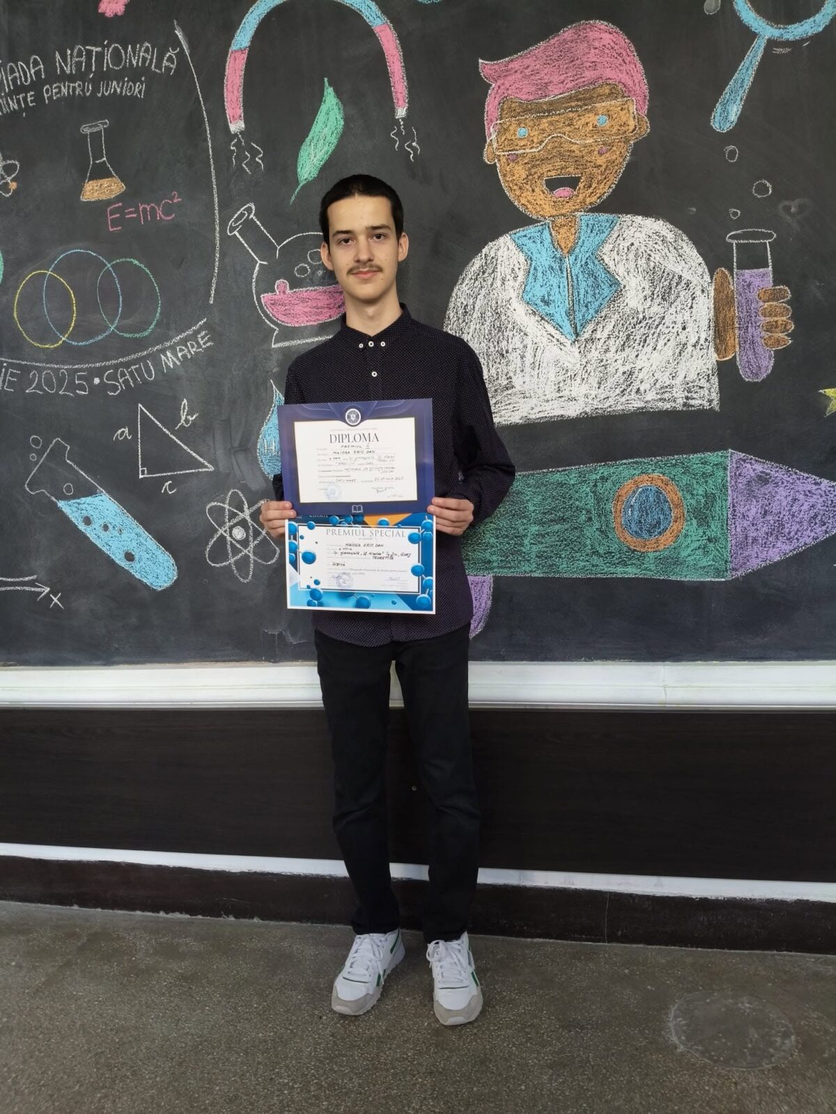 „Săptămâna aceasta, în cadrul etapei naționale a Olimpiadei Interdisciplinare „Științe pentru Juniori”, desfășurată la Satu Mare, elevul Maioga Eric Dan din clasa a VIII-a C a obținut PREMIUL II, reușind totodată să obțină cel mai mare punctaj la proba teoretică de fizică! Profesori îndrumători: Fizică – prof. Grigore Graziela; Chimie – prof. Paraschiv Daniela; Biologie – prof. Petcu Adriana.