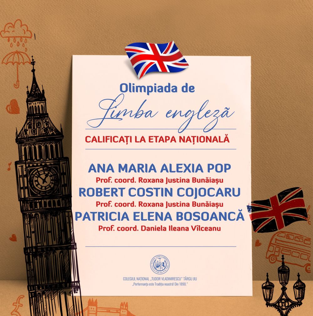 Două fete și un băiat, elevi în cadrul Colegiului Național ”Tudor Vladimirescu” Târgu Jiu au reușit performanța de a se califica la etapa națională a Olimpiadei de Limba Engleză.