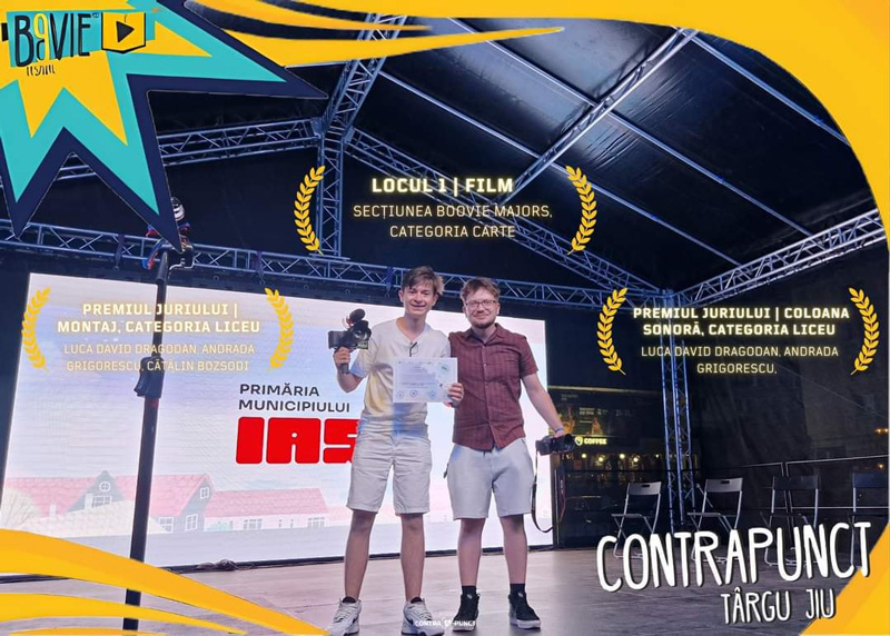 Boovie, festivalul internaţional de book-trailere realizate de elevi, ajuns la a IX-a ediţie, s-a desfăşurat la Iaşi, în perioada 23-26 iulie, cartea fiind personajul principal al ediţiei. Echipa ContraPunct de la Colegiul Național „Tudor Vladimirescu”, din Târgu Jiu, condusă de Luca David Dragodan, a obținut mai multe premii.
