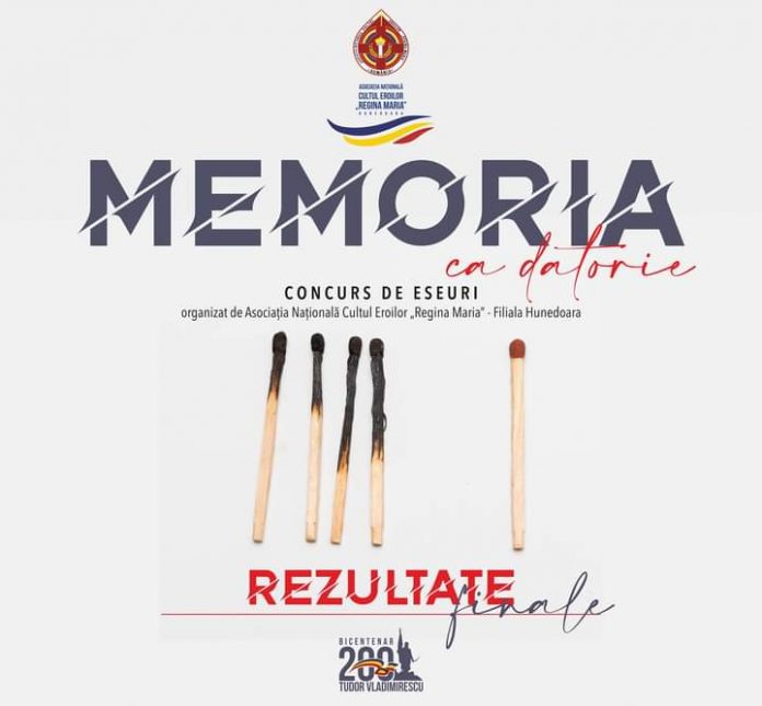 Au fost anunțate rezultatele primei ediții a concursului de eseuri „Memoria ca datorie”, organizat de Asociația Națională Cultul Eroilor „Regina Maria” – Filiala Hunedoara. Competiția s-a adresat elevilor de liceu din județele Hunedoara și Gorj. Elevii gorjeni au obținut rezultate foarte bune la acest concurs, reușind să-și adjudece majoritatea premiilor oferite de organizatori.