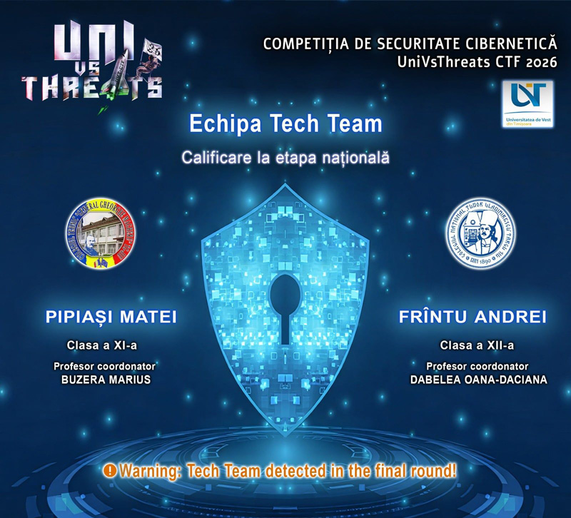 „Felicitări echipei Tech Team formată din elevii Pipiași Matei (Colegiul Tehnic „General Gheorghe Magheru”) și Frîntu Andrei (Colegiul Național „Tudor Vladimirescu”) pentru calificarea la faza națională a Competiției Naționale UniVsThreats CTF (de securitate cibernetică) ce urmează a se desfășura în 2-3 mai în cadrul Universității de Vest din Timișoara”, a anunțat Colegiul Tehnic „General Gheorghe Magheru” din Târgu Jiu.