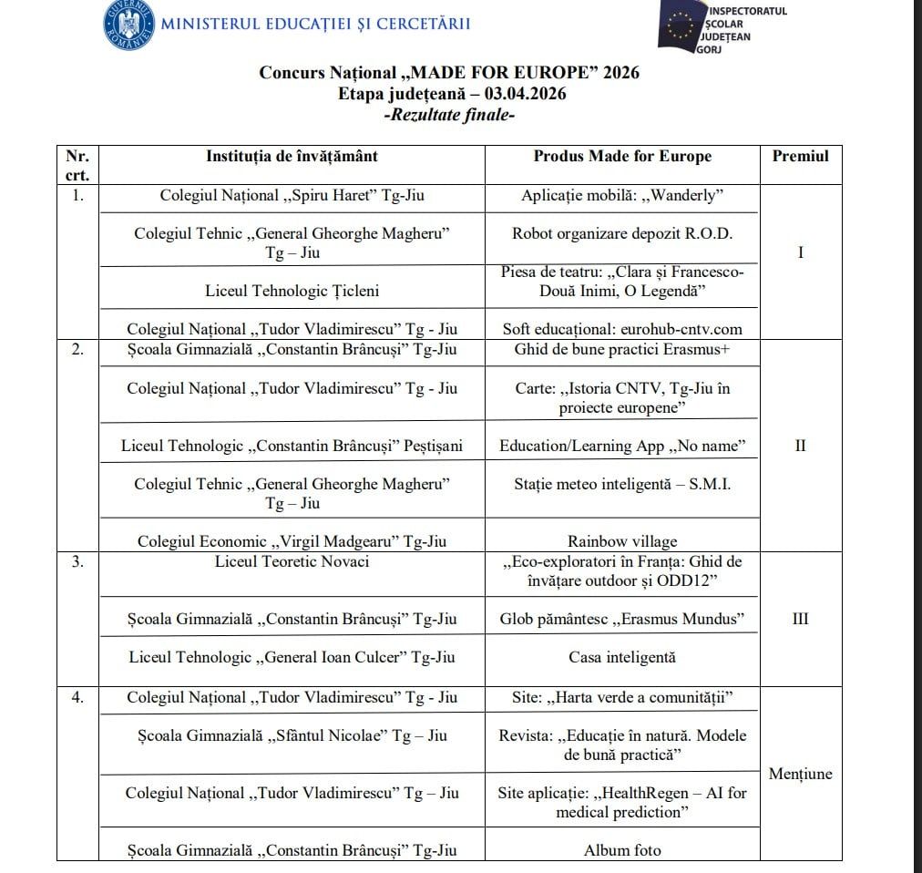 Mai mulți elevi din județul Gorj au obținut premii la etapa județeană a concursului „Made for Europe”, competiție inclusă în Calendarul concursurilor naționale școlare finanțate de Ministerul Educației.