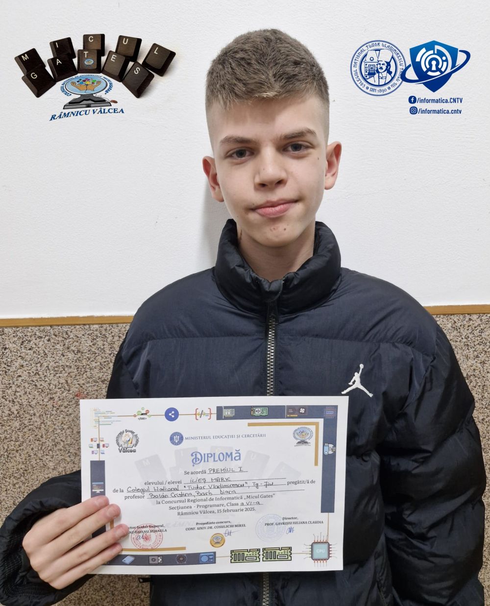 „Felicitări, Mark Ilieș (6A), pentru Premiul I obținut la Concursul Regional „Micul Gates”! Competiția s-a desfășurat la Râmnicu Vâlcea, 15 februarie 2025, și a pus la încercare cunoștințele elevilor de gimnaziu printr-o probă practică de informatică și o probă teoretică de matematică. Mark a demonstrat excelență, pasiune și dedicare, reușind să se claseze pe primul loc! Profesori coordonatori: Cristina-Maria Boian şi Diana-Tamara Barb, Cristiana-Constantina Prunariu”, a informat Colegiul Național „Tudor Vladimirescu”.