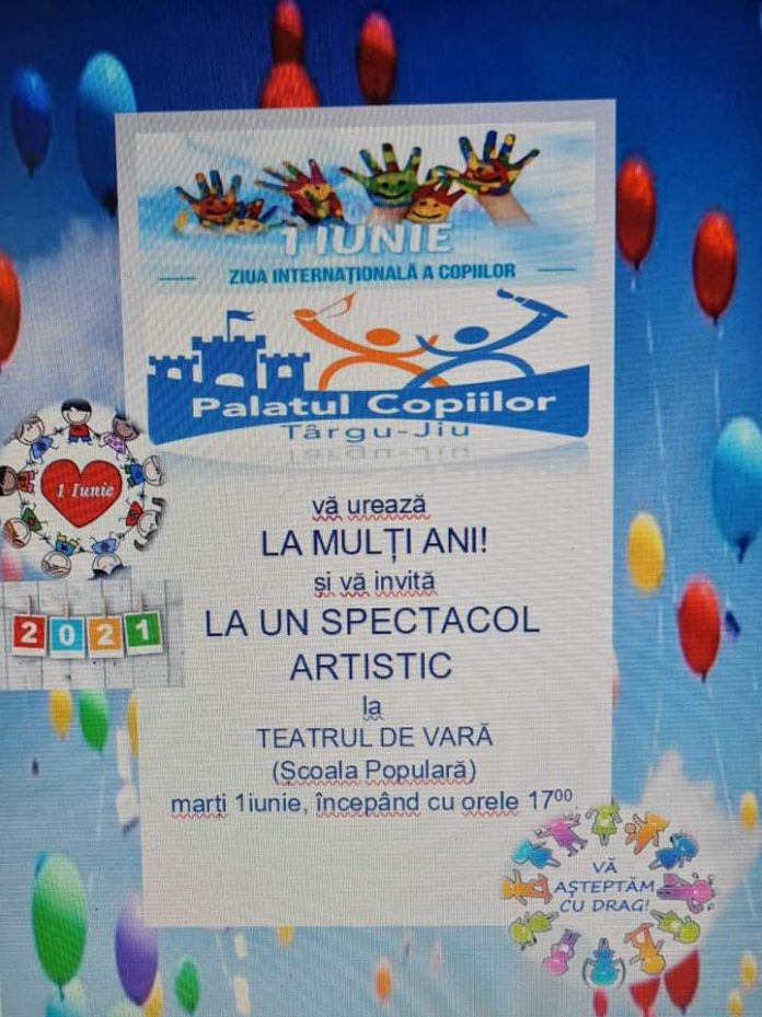 Ziua Copilului va fi marcată și de Palatul Copiilor Târgu Jiu. Marți, 1 iunie, începând cu ora 17:00, instituția va organiza un spectacol artistic la Teatrul de Vară din Târgu Jiu, spectacol la realizarea căruia își vor aduce contribuția elevi de la mai multe cercuri ale Palatului.
