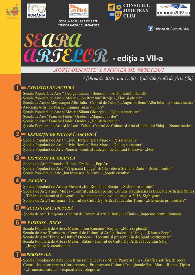 Școala Populară de Artă (ŞPA) Târgu Jiu, instituție aflată în subordinea Consiliului Județean Gorj, este invitată să participe în perioada 7-8 februarie, la Cluj Napoca, la o amplă manifestare cultural-artistică, denumită „Seara Artelor”, ediția a VII-a. La ediția din acest an vor participa cu expoziții tematice școli de arte și centre culturale din țară. Activitatea va începe pe data de 7 februarie, la ora 17.00, prin pornirea într-un periplu prin galeriile de artă ale Școlii Populare de Artă “Tudor Jarda”, atelierele de creație, sălile de curs, pentru ca în final, după parcurgerea celor aproximativ 25 de expoziții, să se desfășoare un moment artistic în care își vor da concursul cursanții Școlii Populare de Arte “Tudor Jarda” de la secțiile muzicale.