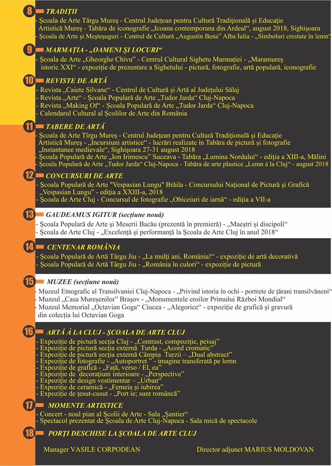 În cadrul acestui eveniment cursanții ŞPA Târgu-Jiu, clasa de pictură, coordonați de prof. Gabriela Tâlvescu, vor expune lucrări sub titlul “România în culori”, iar cursanții clasei de artă decorativă, coordonați de prof. Daciana Ungureanu, vor expune lucrări de artă decorativă, sub titlul “La Mulți Ani, România!”. Iubitorii de frumos vor putea admira, așadar, expoziții de arte vizuale (pictură, grafică, ceramică, arhitectură) și se vor putea bucura de momente muzicale de calitate. Expoziția va putea fi vizitată timp de o lună.