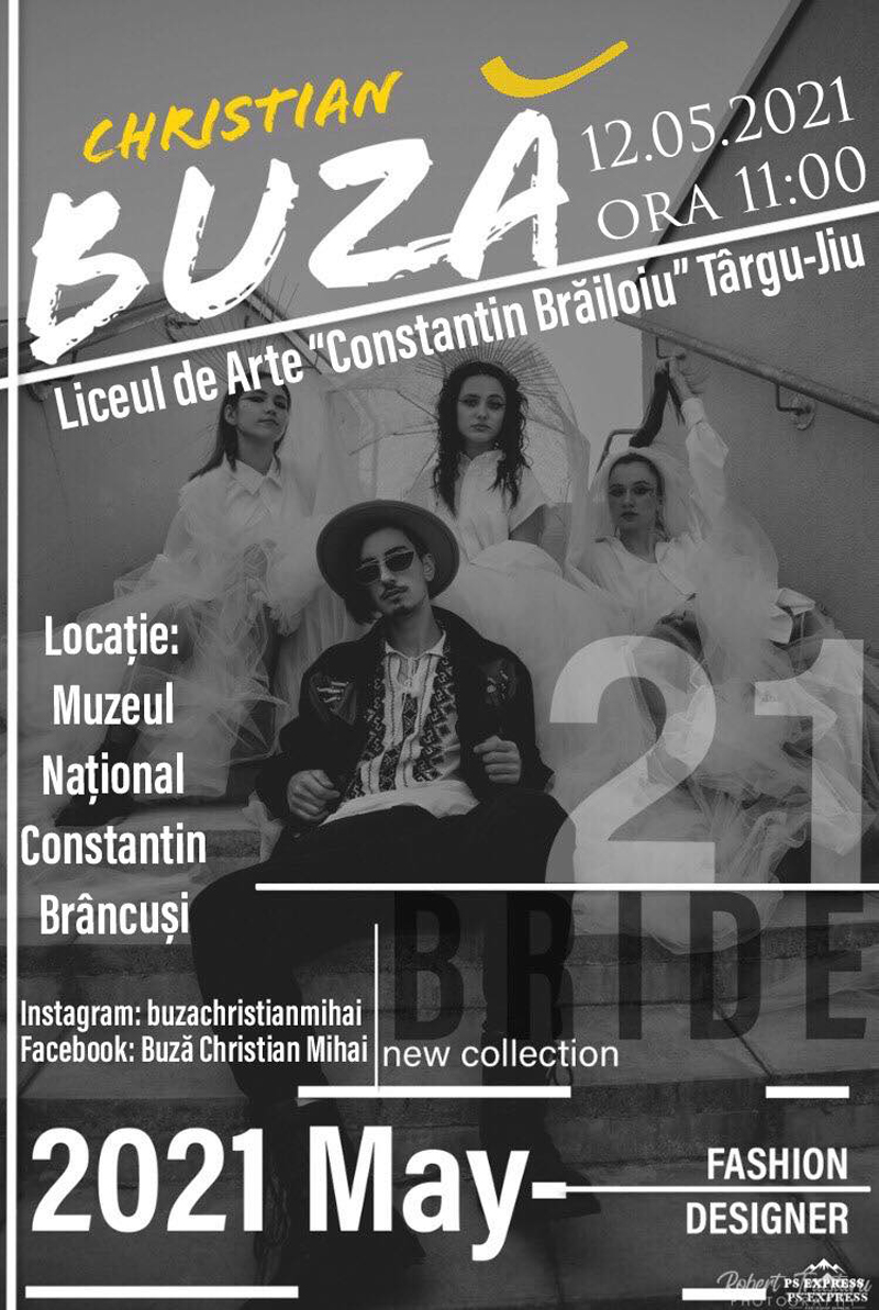Christian Buză, elevul talentat de la Liceul de Arte din Târgu-Jiu, cel care a lansat o colecție vestimentară realizată din produse reciclabile, dar și colecția ,,Arhaic” pentru 145 de ani de la nașterea sculptorului Brâncuși, pregătește un nou eveniment inedit. Mai exact, la Muzeul Național ,,Constantin Brâncuși” din Târgu-Jiu se va lansa astăzi o nouă colecție ce poartă semnătura tânărului fashion designer. Tânărul Christian Buză este elev al Liceului de Arte „Constantin Brăiloiu”, unde studiază artele plastice de 3 ani de zile, fiind elev în clasa a XI-a. Pasiunea pentru modă și-a descoperit-o în urmă cu aproximativ 4 ani de zile, atunci când se pregătea să susțină admiterea la liceu: „Marea mea pasiune este moda, pe care am descoperit-o în urmă cu 3-4 ani, atunci când mă pregăteam de admiterea pentru liceu și gândindu-mă ce vreau sa fac după terminarea liceului.”
