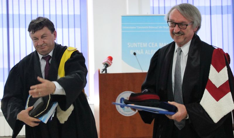 Joi, 16 iunie 2016, într-un cadru festiv deosebit, Senatul Universității «Constantin Brâncuși» din Tg. Jiu a acordat înaltul titlu academic de Doctor Honoris Causa, eminentului savant german, academician și prof. univ. dr. Günther Stock, cunoscut om de ştiinţă, academician, doctor în medicină, profesor de recunoaştere internaţională, strălucit manager academic, personalitate de primă mărime și de anvergură europeană și mondială a vieții științifice, Preşedintele «All European Academies», Federaţia care reuneşte 55 de Academii din peste 40 de ţări din Europa, savant care prin valenţele ce-i definesc sistemul de gândire, forţa ideilor promovate, valorifică ascendenţele gândirii sale inovatoare şi capacităţile inegalabile de a se implica şi a ne dărui cu altruism adevărate comori ale cercetării și ale cunoașterii societății de astăzi. La festivitatea, care s-a desfășurat la sediul Universității din Campusul Studențesc Debarcader, str. Tineretului nr. 4, au participat membrii Senatului Universității, în frunte cu domnul Președinte, prof. univ. dr. Adrian Gorun și d-na rector, prof. univ. dr. ing. Luminița Georgeta Popescu, personalităţi de prestigiu ale vieţii academice, ale medicinei şi artei, precum: Mircea Beuran, Bogdan Popescu, Filmilian Calotă, Constantin Barbu, Bogdan Cuza, o serie de reprezentanți ai conducerii autorităților publice municipale și județene, printre care domnii: Ion Călinoiu, Ciprian Florescu, d-l prefect Gheorghe Paraschiv, d-l primar, Florin Cârciumaru, o serie de cadre universitare, directori de unități școlare, invitați din domeniile învățământului și culturii.