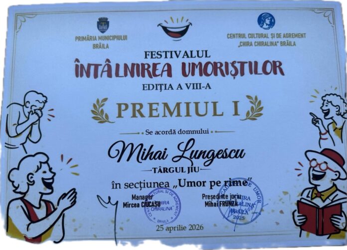 Centrul Cultural și de Agrement CHIRA CHIRALINA Brăila, în colaborare cu Academia de Umor CHIRA CHIRALINA, au organizat și desfășurat sâmbătă, 25 aprilie 2026, la Casa Umorului Desenat din Brăila, Gala Laureaților celei de-a VIII-a ediții a Festivalului-Concurs „Întâlnirea Umoriștilor”, unde președintele Cenaclului „Hohote” din Târgu Jiu, epigramistul gorjean Doru-Mihai Lungescu, a obținut premiul I.