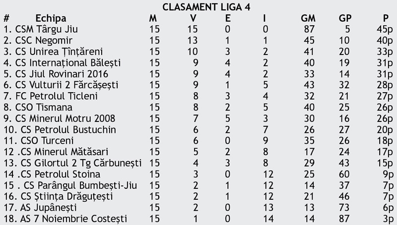 CSM Târgu Jiu și CSC Negomir continuă cursa în fruntea clasamentului. Cele două formații au câștigat și în runda cu numărul 15 din Liga a patra gorjeană și se vor întâlni în etapa a 17-a, ultima din anul 2024, la Negomir. Până atunci, liderul cu victorii pe linie va evolua pe teren propriu, împotriva Jiului Petroșani, iar băieții lui Cristi Barbu au în față o deplasare grea, la Internațional Bălești. Revenind la meciurile de acum câteva zile, la Turceni și Fărcășești a plouat cu goluri, iar singura remiză s-a înregistrat, duminică, la Bumbești Jiu.