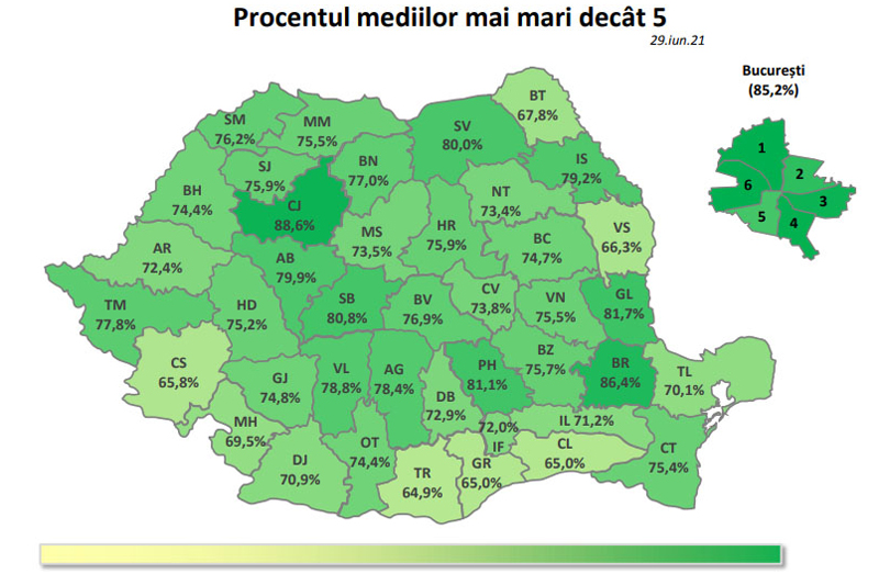 Potrivit datelor publicate de Ministerul Educației, la nivelul județului nostru s-au înregistrat 1558 de medii mai mari sau egale cu 5, după cum urmează: medii între 5-5,49 – 164, medii între 5,5-5,99 – 185, medii între 6-6,49 – 172, medii între 6,5-6,99 – 192, medii între 7-7,49 – 182, medii între 7,5-7,99 – 177, medii între 8-8,49 – 168, medii între 8,5-8,99 – 124, medii între 9-9,49 – 126 și medii între 9,5-9,99 – 68.