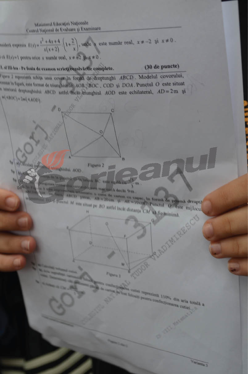 Absolvenţii de clasa a VIII-a au susţinut miercuri cea de-a doua şi ultima probă din cadrul Evaluării Naţionale – proba la Matematică. Subiectele pe care candidaţii le-au avut de rezolvat au fost structurate pe trei mari cerinţe, cu mai multe sub-puncte. Fiecare dintre cele 3 cerinţe a fost notată cu câte 30 de puncte, iar 10 puncte au fost din oficiu. La examenul de miercuri a fost extrasă varianta de subiecte numărul 3, iar absolvenţii de gimnaziu au avut la dispoziţie două ore pentru rezolvarea acestor subiecte. Dacă de la proba la Limba română, candidaţii au ieşit din sălile de examen chiar şi cu 30 minute înainte de expirarea timpului alocat, la Matematică situaţia a fost diferită, elevii aşteptând până în ultima clipă înainte de a părăsi sălile. La ieşirea din săli, candidaţii au recunoscut că subiectele nu au fost chiar uşoare. Chiar şi aşa, unii dintre ei s-au declarat încrezători că vor obţine o notă mare. „Am făcut tot. A doua problemă mi s-a părut mai dificilă. A fost mai uşor la română; am terminat mai repede luni. Sper să iau 10”, a spus un elev. Ca şi data trecută, cei mai emoţionaţi au fost părinţii. „Încă nu a ieşit fiica mea de la examen, dar a ieşit prietena ei. Am văzut subiectele şi mi s-au părut foarte grele. Am emoţii foarte mari. Este deja aproape ora 11:00 şi nu au ieşit decât unul sau doi elevi. Ei zic că au făcut, dar să vedem notele”, a spus mama unei candidate.