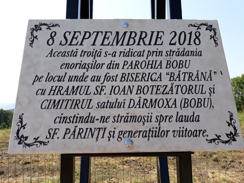 spune că dăinuie din vremea dacilor, prin preajmă fiind Mănăstirea Polovragi și Peștera lui Zalmocse (vezi sinonimia Dârmocsa – Zalmocse), fapt ce poate constitui o ipoteză de lucru pentru istorici și etnologi în confirmarea perenității poporului român în spațiul geto-dacic. O placă de marmură cu inscripția ” 8 sept 2018 – Această troiță s-a ridicat prin strădania enoriașilor din Parohia Bobu pe locul unde a fost Biserica Bătrână cu hramul Sf. Ioan Botezătorul și cimitirul satului Dârmocsa (Bobu) cinstindu-ne strămoșii spre lauda Sfinților Părinți și generațiilor viitoare” încununează o frumoasă lucrare de cult creștin, așezată pe un potențial traseu turistic ce pleacă din Satul Raba spre ”Casele boierești”, ce au aparținut boierului Din Mihail și continuă pe culmea Dealului Bobu spre Pivnițe și satul Glodeni lăsând în stânga și dreapta frumoase peisaje naturale spre Valea Bobului și Valea Scoarței. La sfințirea ei în ziua de 8 septembrie a.c, participă slujitori ai Bisericii, enoriași, iubitori întru credință creștină, precum și cei care-or vrea să cinstească tradiția, istoria și datina străbună a locului, cu toții primind deopotrivă binecuvântarea vrednicului gospodar și cinstitului preot paroh Rotariu Terente Cristinel.