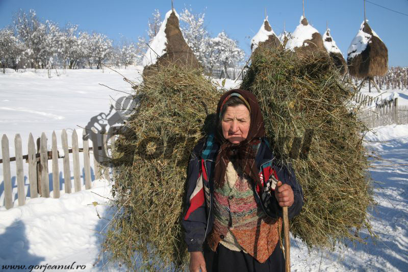Un peisaj ne arată un drumeag printre copacii unei pădurici, în care şi copacii şi drumeagul sunt după o ninsoare ca în basme. Alte clăi de fân acoperite de zăpadă şi de ceaţă, apoi o bătrânică cu baston şi cu o legătură zdravănă de fân în spinare, pe fundalul altor cinci clăi de fân, gardurile din blăni de lemn delimitează micile proprietăţi şi prin zăpadă. Care zăpadă acoperă tot, chiar şi troiţe, iar un măgăruş, o