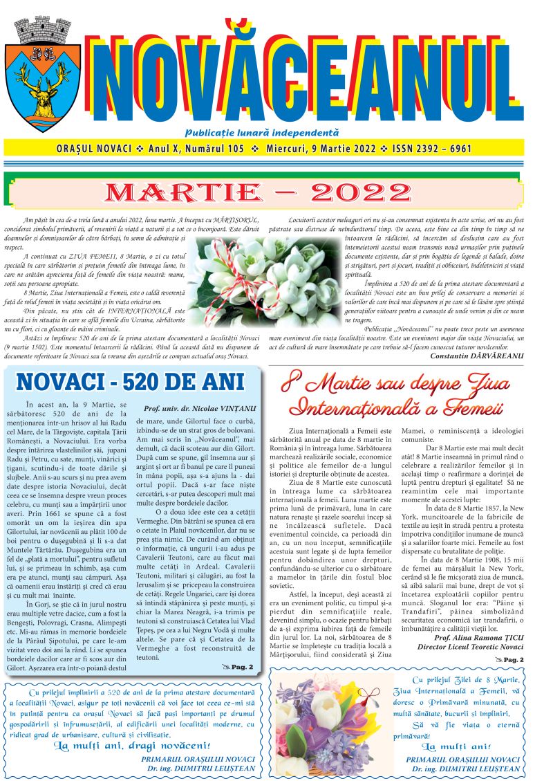 Numărul 105 al publicației lunare independente NOVĂCEANUL are ca principală temă sărbătorirea, pe 9 Martie 2022, celor 520 de ani de la menționarea într-un hrisov al domnitorului Radu cel Mare de la Târgoviște, capitala de atunci a Țării Românești, a Novaciului.