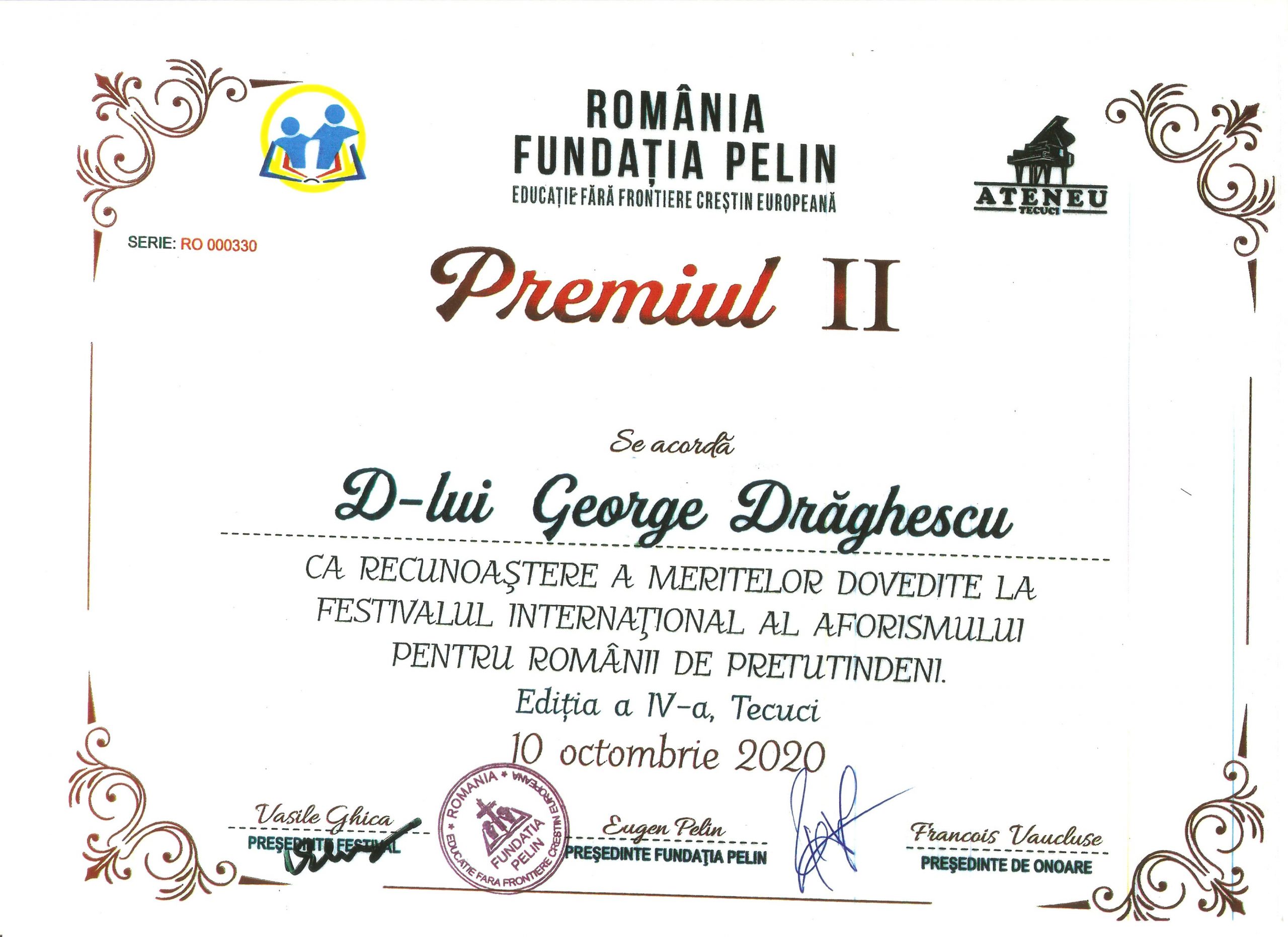 Iată-l recent posesor al Premiului II la Festivalul Internaţional al aforismului pentru românii de pretutindeni de la Tecuci a cărei a IV-a ediţie a avut aceeaşi onorantă autoresponsabilitate faţă de valorile româneşti.