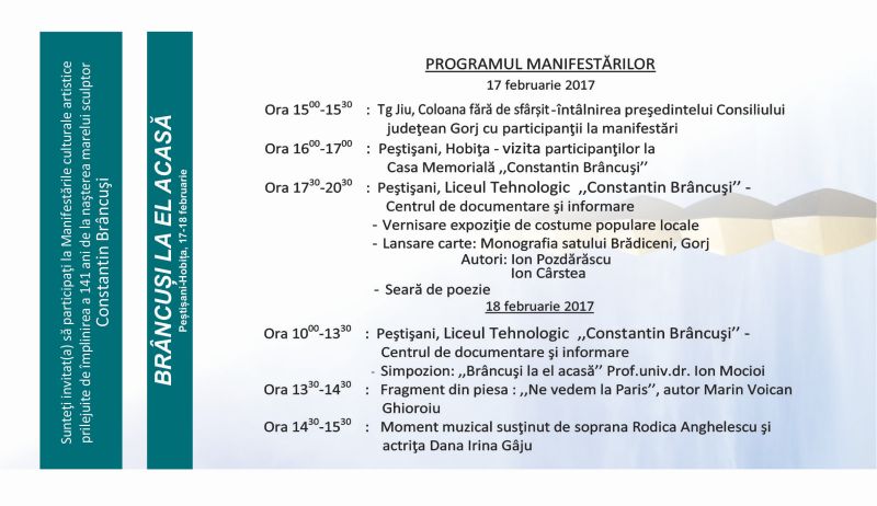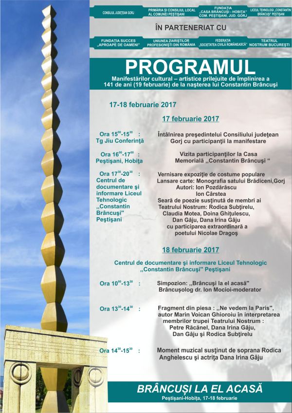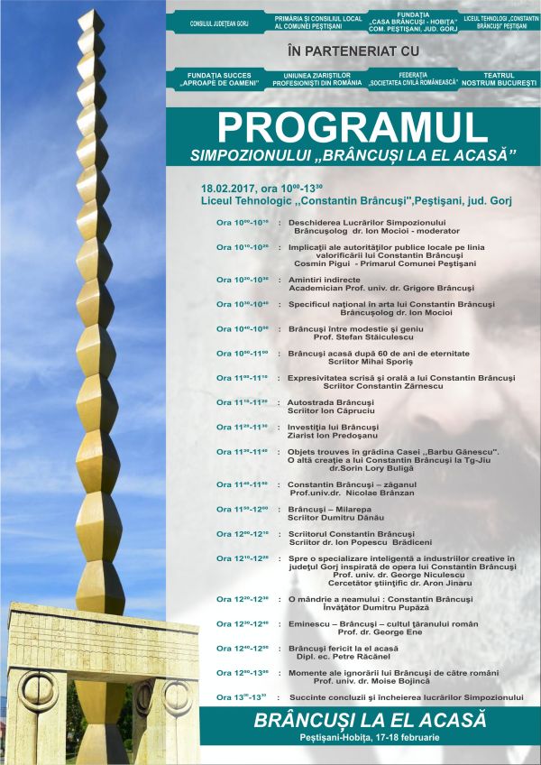 avea loc sâmbătă, între orele 10.00-13.00, în Sala Centrului de Documentare şi Informare al Liceului Tehnologic „Constantin Brâncuşi” Peştişani. Principalul organizator este Fundaţia Culturală „Casa Brâncuşi-Hobiţa”, preşedinte prof.univ.dr. Moise Bojincă, distins cărturar ce a pus mult suflet şi profesionalism extrem de meticulos, după cum îi este firea.