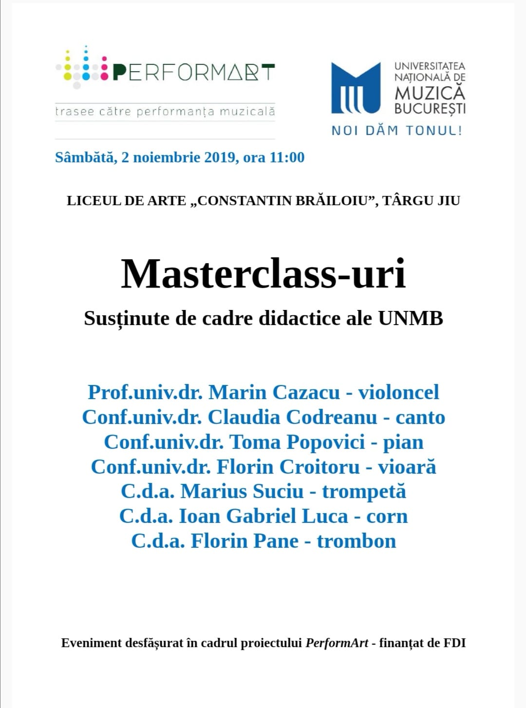 Liceul de Arte „Constantin Brăiloiu” Târgu Jiu, în parteneriat cu Universitatea Națională de Muzică București, vă invită să participați la o sesiune extraordinară de evenimente cultural-artistice sub egida PerformArt: