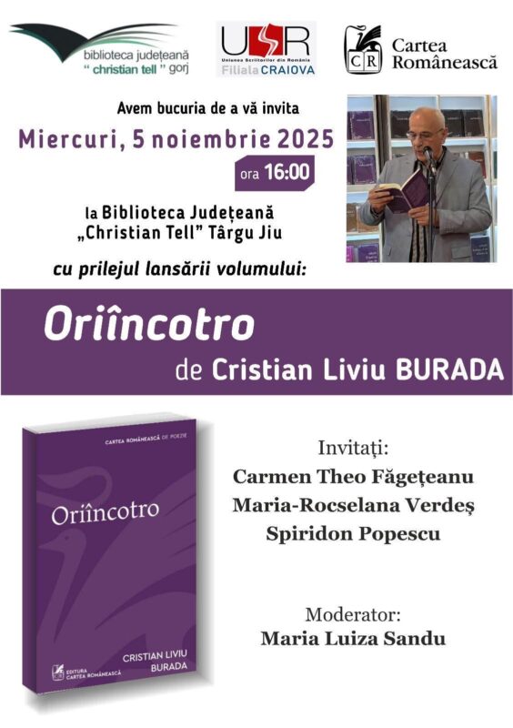 Evenimentul este dedicat poeziei contemporane, emoției și reflecției interioare în universul liric al autorului Cristian Liviu Burada, realizat în parteneriat cu Uniunea Scriitorilor din România – Filiala Craiova și Editura Cartea Românească.
