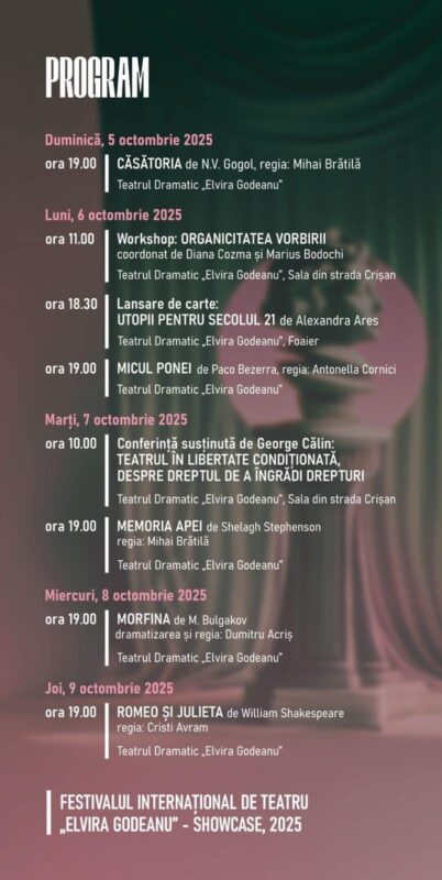 Pe parcursul acestei săptămâni, publicul va putea urmări unele dintre cele mai noi producții ale teatrului din Târgu Jiu, regizate de artiști consacrați, într-o selecție ce evidențiază diversitatea și calitatea expresiei teatrale contemporane, dar și trei expoziții de fotografie apreciate în decursul anilor la nivel național și internațional.